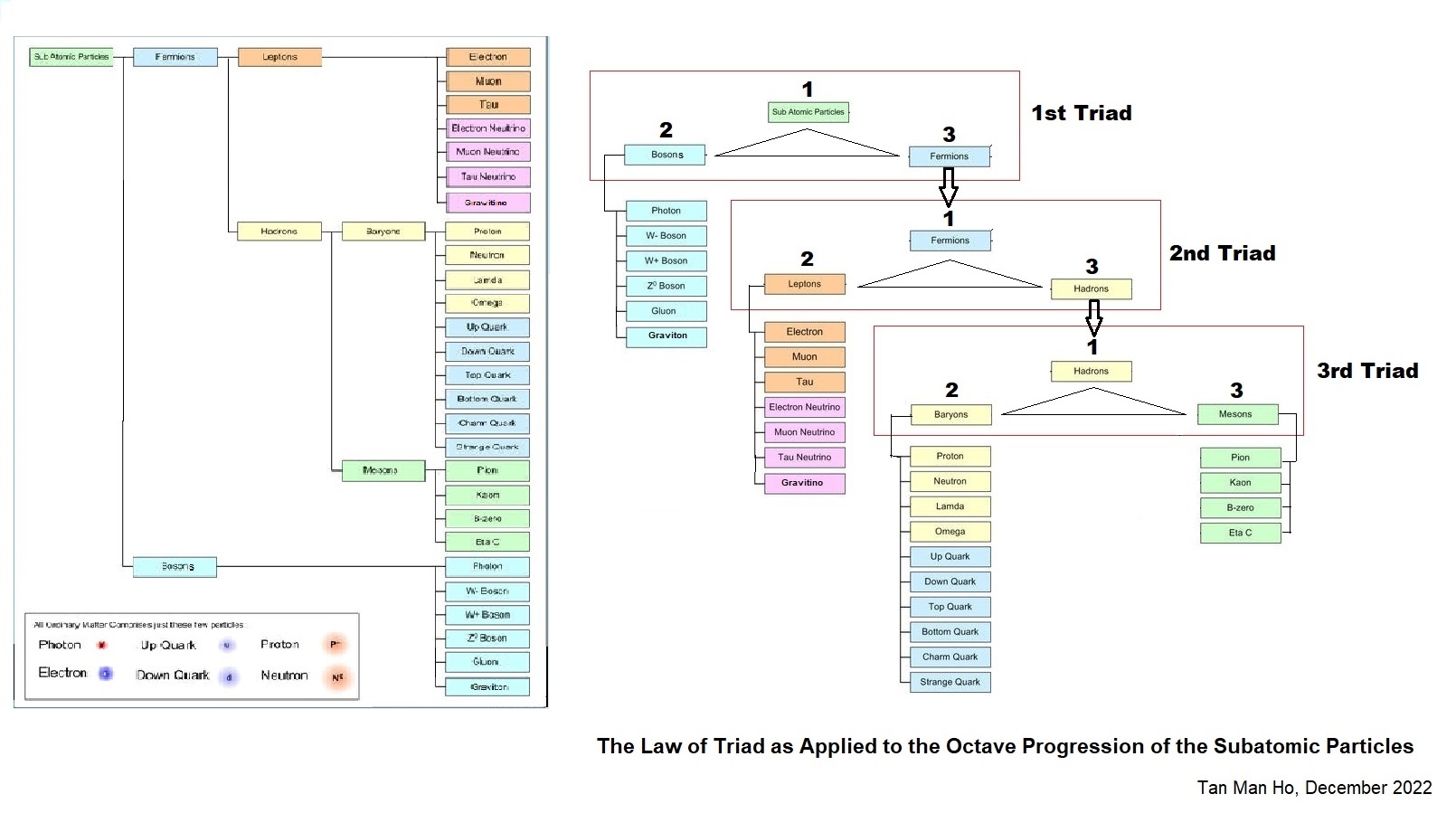 A 1st Triad is possible consisting of the sub-atomic particles (1), the Bosons (2) and the Fermions (3) which leads to the 2nd Triad consisting of the Fermions (3 becomes 1), the Leptons (2) and the Hadrons (3) which then leads to the 3rd Triad which consists of the Hadrons (3 becomes 1), the Baryons (2) and the Mesons (3). The Bosons, the Leptons, the Baryons and the Mesons each of them has its own inner octaves of elementary particles or distinct sub-atomic particles.