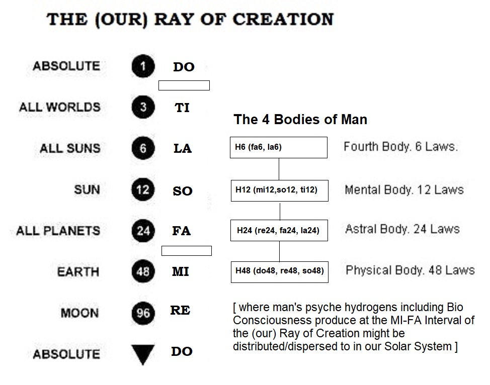 4   (Old version, 1976) The octave of dimensionality begins from Do and ends at Ti.  Our reflecting apparatus on space and time is as such that space and time, although they are both dimension entities, could not be integrated properly.  Besides space and time, eternity, which is also a dimension stopinder could not be integrated properly into the continuum.  By treating the whole continuum as a dimension octave, the whole concept can be put together.  This is because there are two disturbing retardation points in the octave model in general where two shocks could be allowed into the continuum  ‑  one at mi-fa and another one at ti-do.  The union of space, time and eternity, I propose, should be shocked with time at the Mi-Fa Interval to produce the space-time continuum and the union of space-time continuum should be shocked with eternity at the Ti-Do Interval to produce the Great Omnipresent Space-Time-Eternity Continuum  ‑  the complete octave of all dimensions.  These are necessary because of the nature and behavior or the laws peculiar to the formation or psyche hydrogens or consciousness formed, filled and deposited at this much constrained, unfortunate MI-FA Interval of the (our) Ray of Creations amongst trillions of other rays of creation in our universe or other universes if there are.